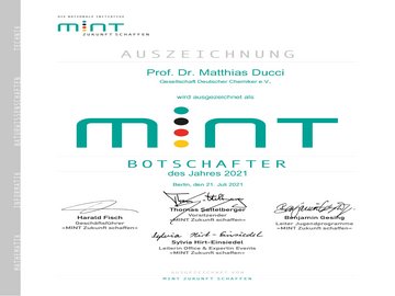 Seit 2013 ist die Pädagogische Hochschule Karlsruhe Sitz eines von bundesweit sieben Chemie-Lehrerfortbildungszentren. Leiter Prof. Dr. Matthias Ducci wurde jetzt von der Initiative „MINT Zukunft schaffen!“ als MINT-Botschafter des Jahres 2021 geehrt. Die Schirmherrin der Initiative, Dr. Angela Merkel, dankte allen MINT-Botschafterinnen und Botschaftern für ihr ehrenamtliches Engagement.