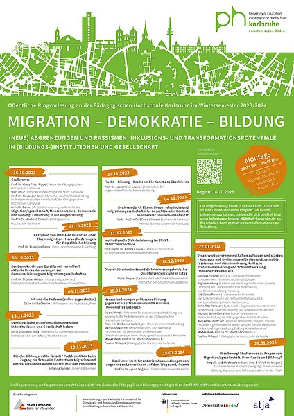 Kooperationspartner der Ringvorlesung „Migration – Demokratie – Bildung. (Neue) Abgrenzungen und Rassismen, Inklusions- und Transformationspotenziale in (Bildungs-)Institutionen und Gesellschaft“ sind das Büro für Integration der Stadt Karlsruhe sowie die Koordinierungs- und Fachstelle Partnerschaft für Demokratie und das Regionale Demokratiezentrum beim Stadtjugendausschuss e. V. Karlsruhe. Ausführliche Informationen zur Ringvorlesung sowie das Programm sind zu finden auf ph-ka.de/mdb.