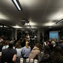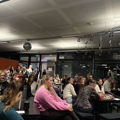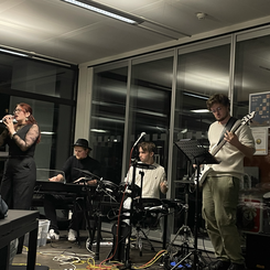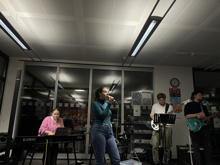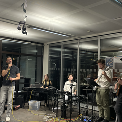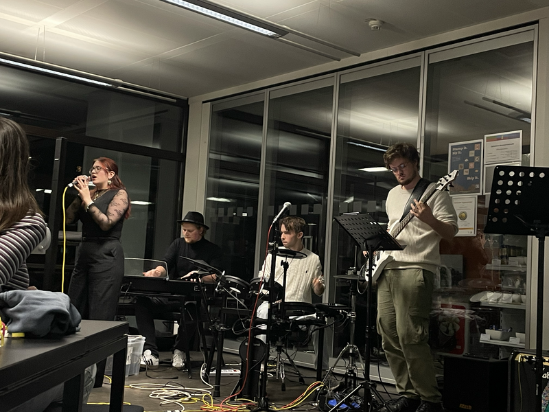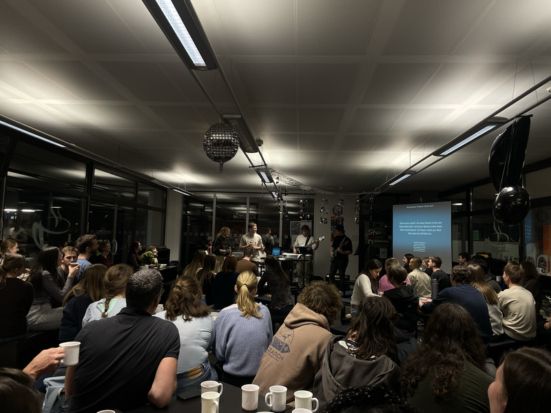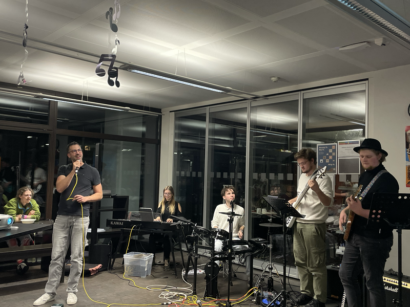 Für den Abend hatte Antoni zudem eine Projektband aus Studierenden zusammengestellt, die Sänger:innen und die Schupra-Studierenden live begleitete. Wie bei einer klassischen Karaoke-Night konnten Songs „auf Zuruf“ gewählt und spontan gesungen werden; aber statt eines Playbacks sorgte jedoch eine echte Liveband für den Soundtrack – mit Textprojektion an der Wand und allem, was dazugehört.