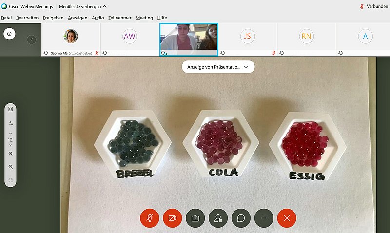 Zwei Studentinnen beispielsweise heißen in ihrem Videokonferenzlabor zuerst alle sich nacheinander zuschaltenden Schülerinnen und Schüler willkommen, erläutern die Sicherheitshinweise, die auch an ihrem Küchenlabortisch gelten, und beginnen die Lerneinheit mit einer lockeren Fragerunde. Sie stellen live Bubble-Tea-Bällchen mit Rotkohlsaftkern her, schieben vorbereitete Folien auf den Bildschirm, füllen Zitronensaft, Wasser und weitere Substanzen in Gefäße, fragen und erklären und lassen die Schüler dokumentieren, welche Bällchen sich in welchem Gefäß wie verfärben. Geduldig optimieren die Studentinnen die Webcam, damit alle gut sehen können, was sich in Gefäß A befindet, und wiederholen gerne, dass Gefäß D Seife enthält. Schritt für Schritt führen sie die Schüler dahin, selbst zu erkennen, dass sich Rotkohlsaft als pH-Wert-Indikator einsetzen lässt.