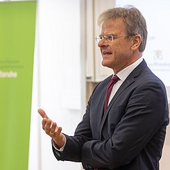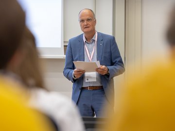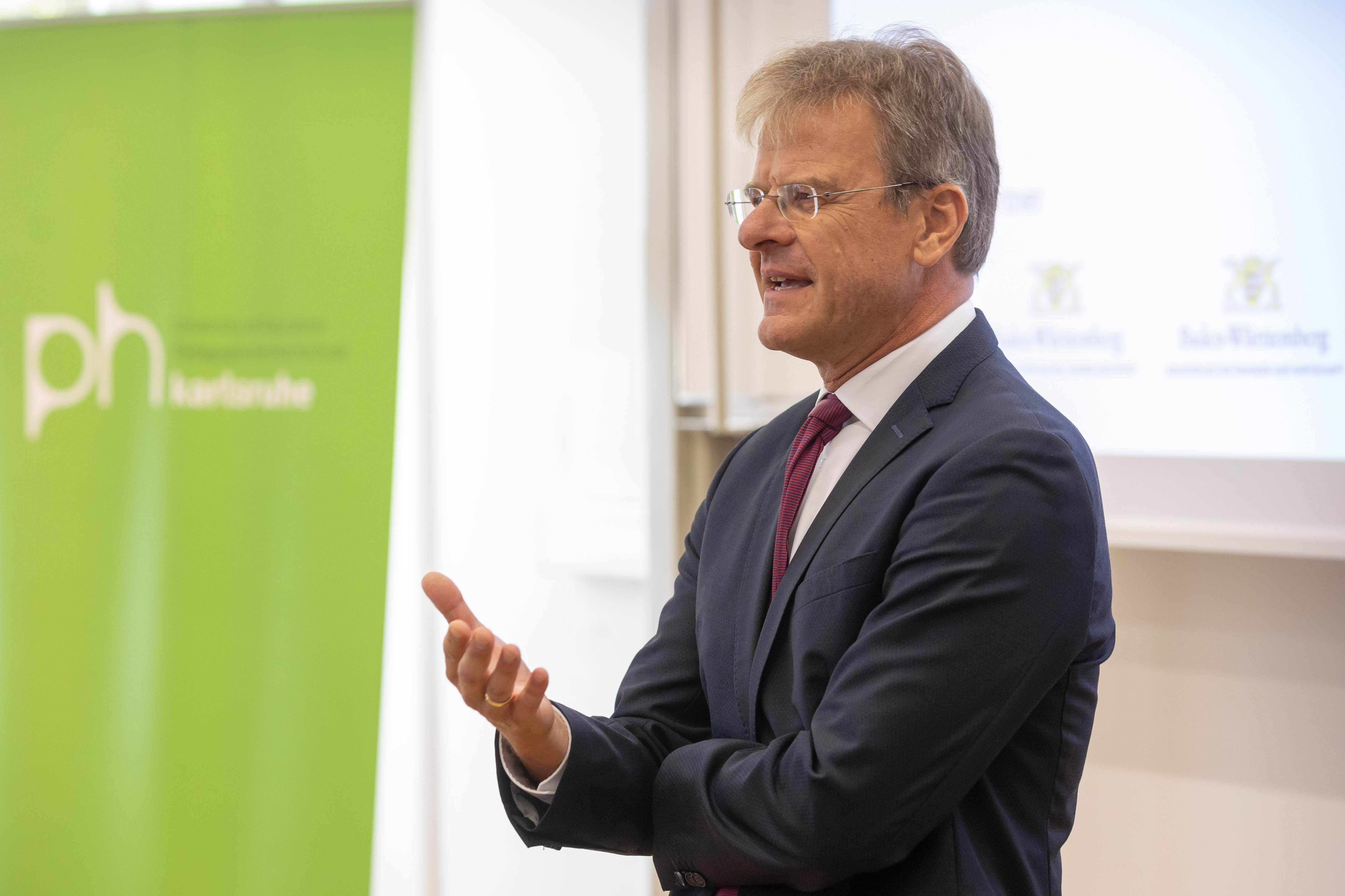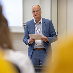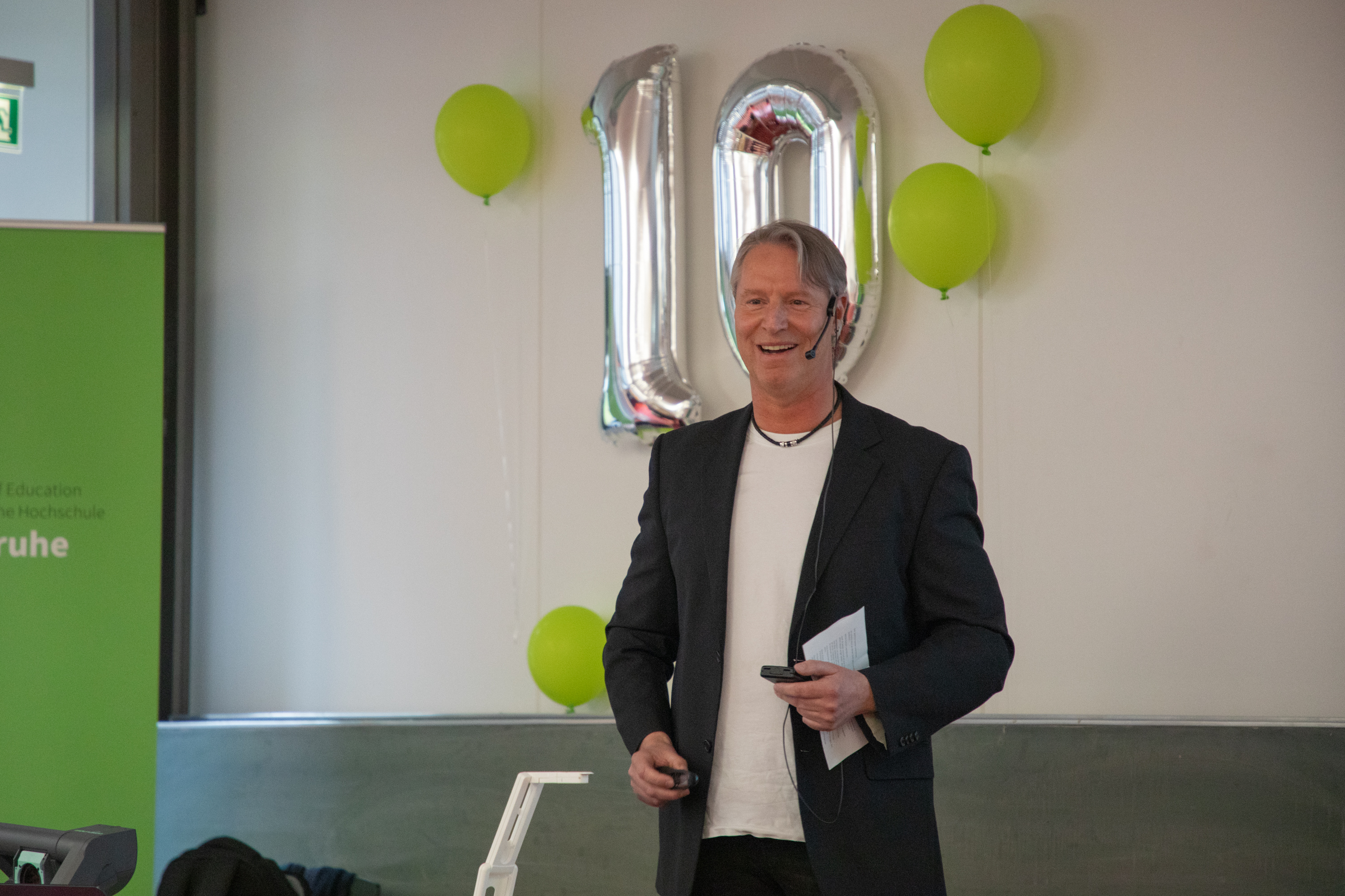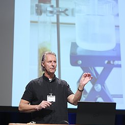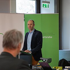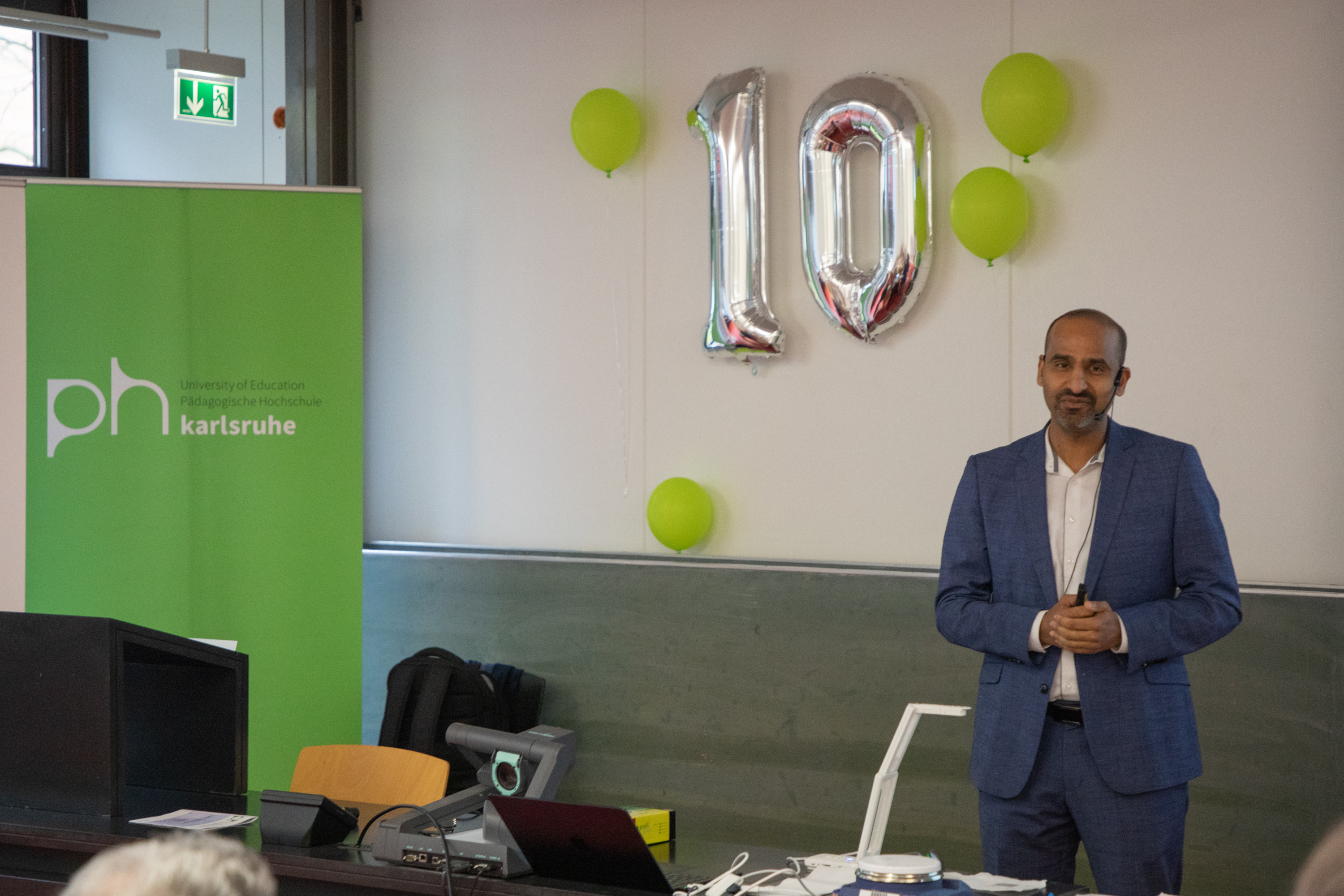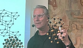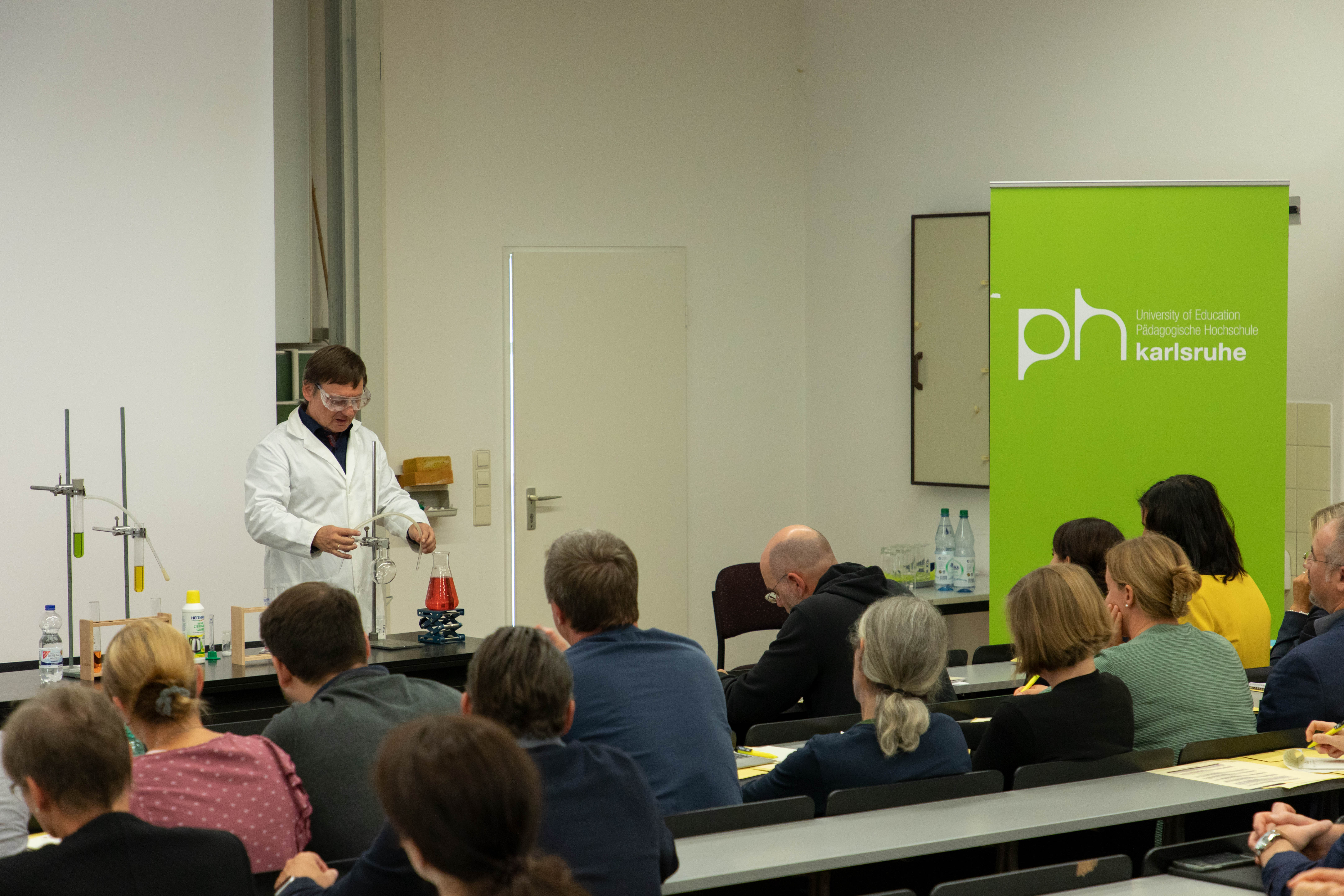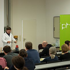 Während der anschließenden Rede im Hörsaal gratulierte Prof. Stefan Schwarzer als Vorsitzender der GDCh-Kommission für Lehrkräftefortbildung dem Fortbildungszentrum und richtete die Glückwünsche der Kommission und der GDCh aus. Er würdigte in seine Rede u. a. das vielfältige Programm und das Engagement der Mitarbeitenden am Standort Karlsruhe. Beides hätte in den letzten 10 Jahren dazu beigetragen, viele erleuchtende Momente für Lehrkräfte regional aber auch überregional zu schaffen. Nach einer freundlichen Begrüßung von Prof. Klaus-Peter Rippe (Rektor der PHKA) und einer kurzen Rede von Dr. Albert Käuflein (Bürgermeister) durften auch ein paar Worte von Prof. Matthias Ducci (Leiter des Fortbildungszentrums) nicht fehlen. Er bedankte sich noch einmal bei der GDCh, den Verbänden der Chemie- und Pharmaindustrie in Baden-Württemberg (Chemie.BW) und der PHKA für die Unterstützung in den vergangen 10 Jahren. Danach rundete Prof. Amitabh Banerji von der Universität Potsdam das Programm mit einem spannenden Experimentalvortrag „Gedruckte Elektronik: Die Hand-gedruckte, flexible Zink-Braunstein-Batterie – Zukunftstechnologie im Unterricht“ ab.