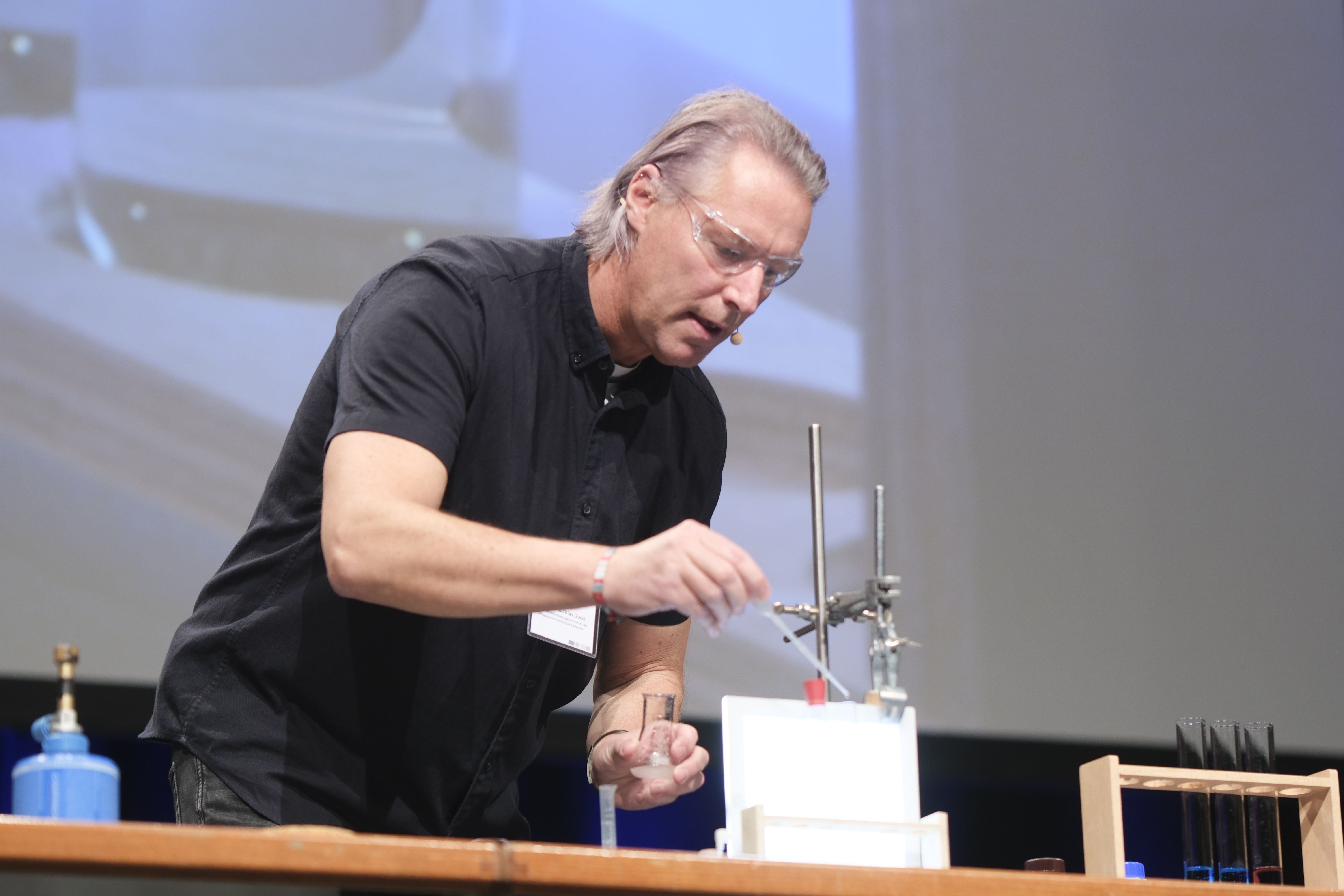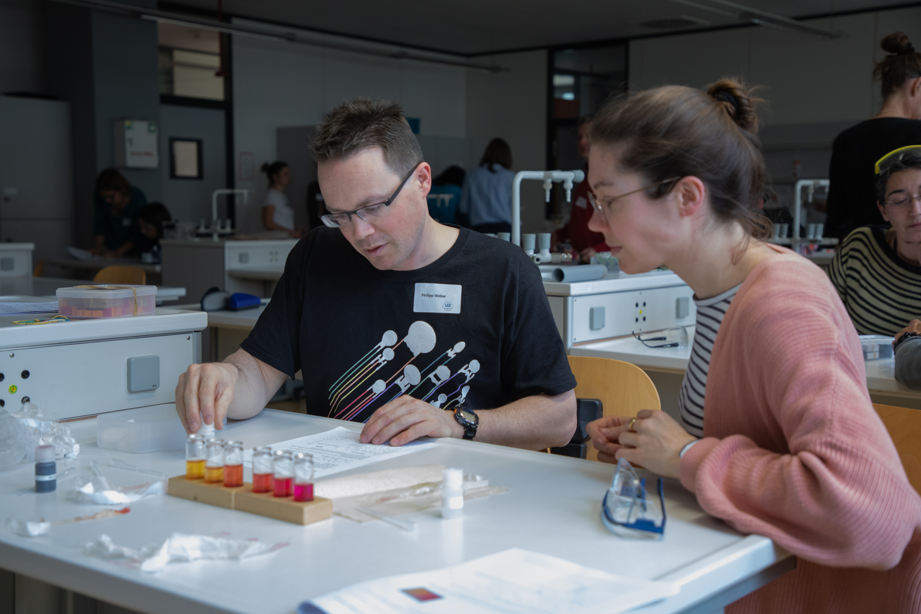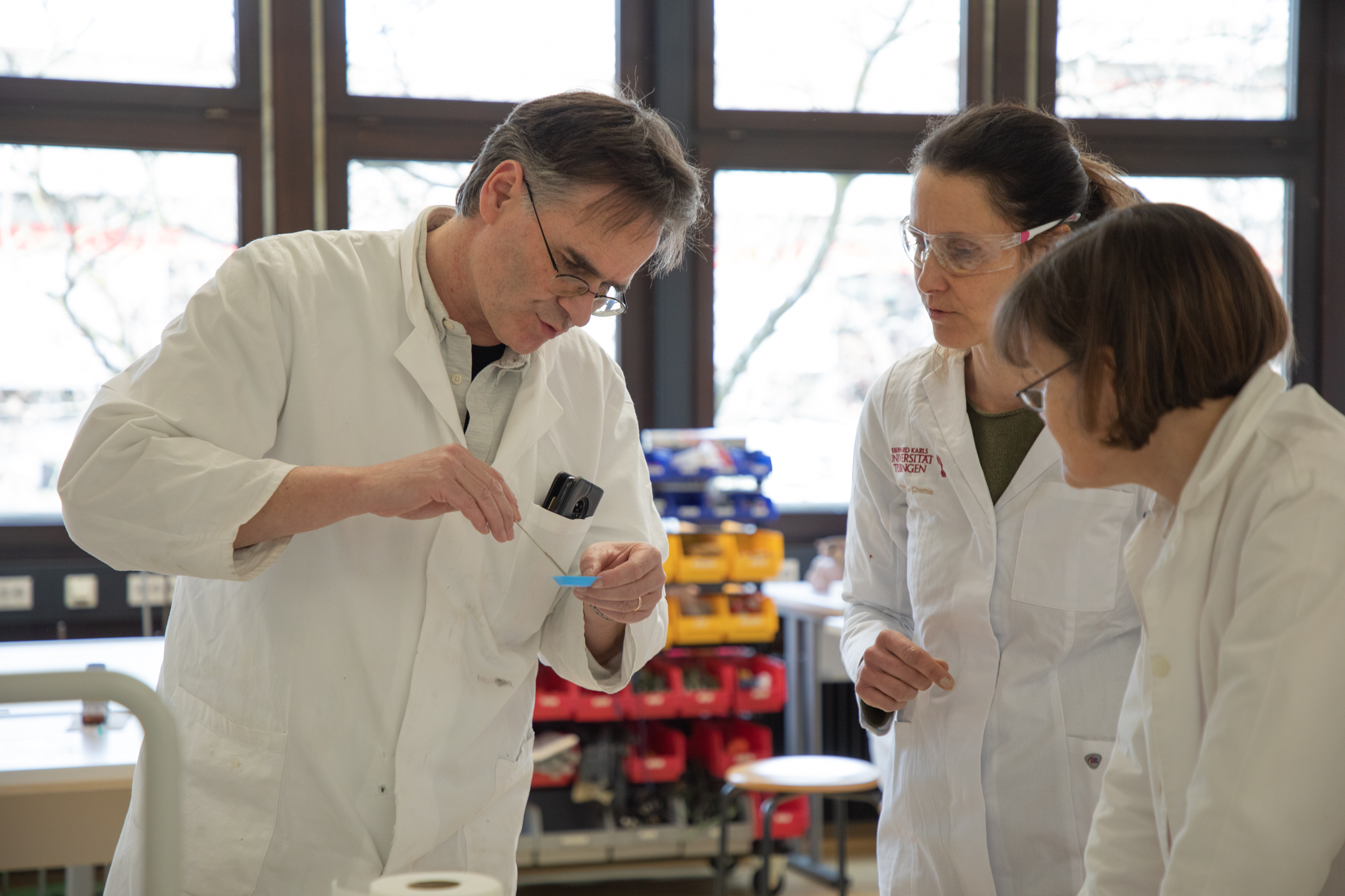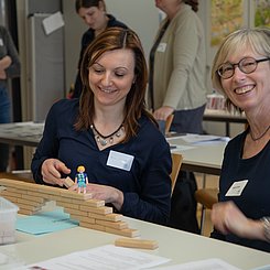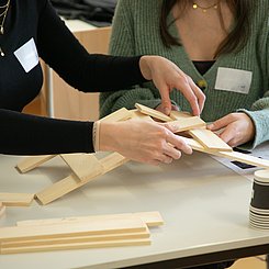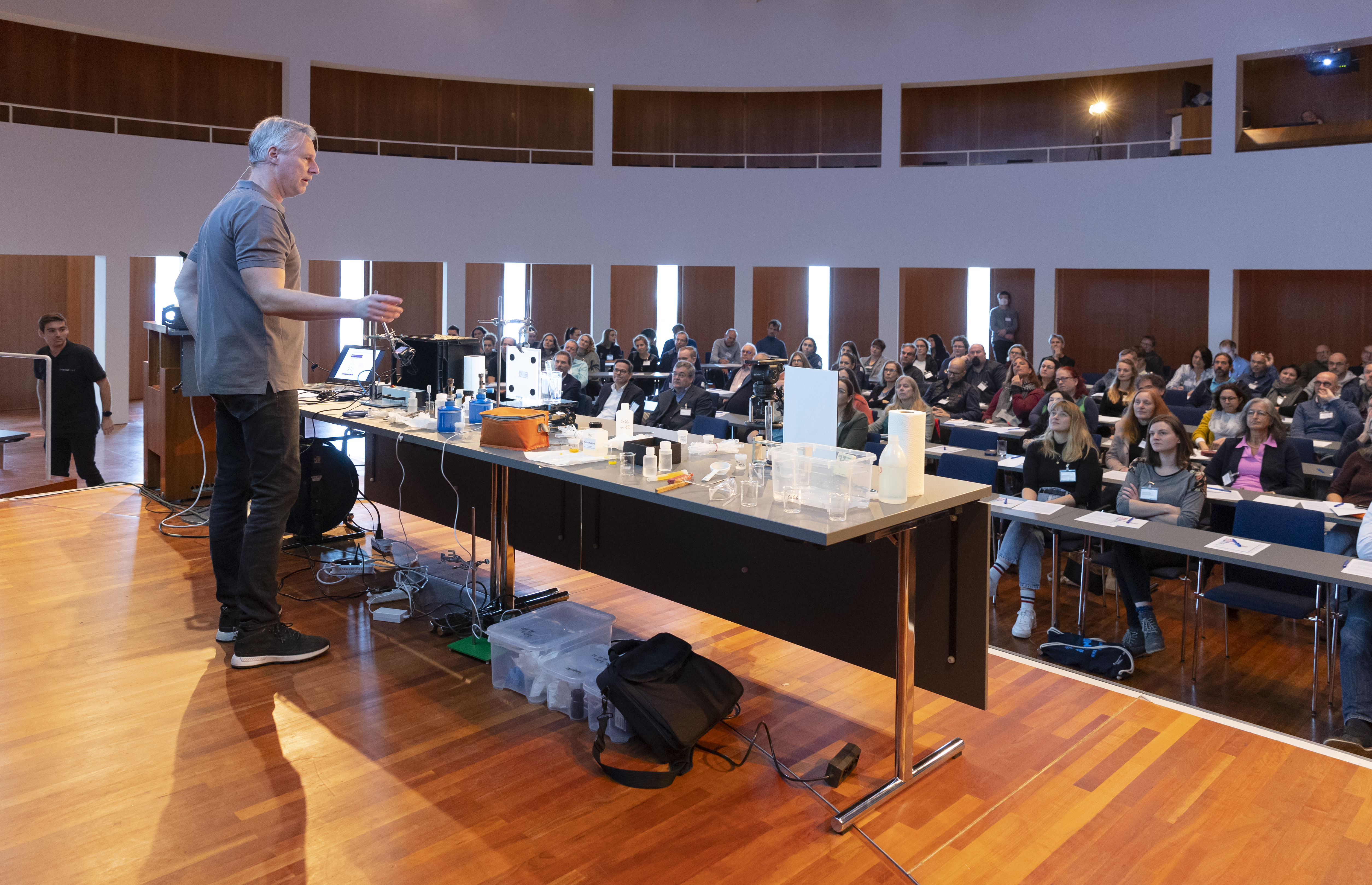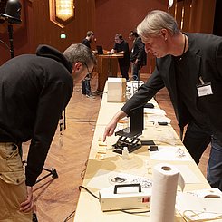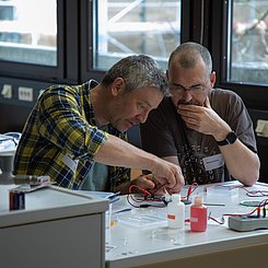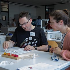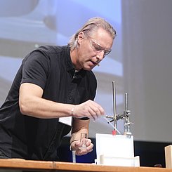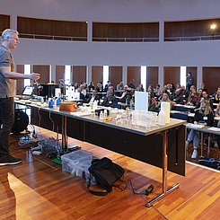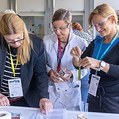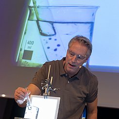 Am Nachmittag starteten für die eingeladenen Lehrkräfte die drei Workshops „Brücken – Erfinden und Konstruieren“ (Science & Technologie e.V.), „Chemie verstehen mit schönen und überraschenden Phänomenen“ (Prof. Klemens Koch, PH Bern) und „Experimente zu modernen Materialien und Nachhaltigkeit im Chemieunterricht“ (Prof. Dr. Stefan Schwarzer, Universität Tübingen) in den Räumen des Instituts für Chemie.