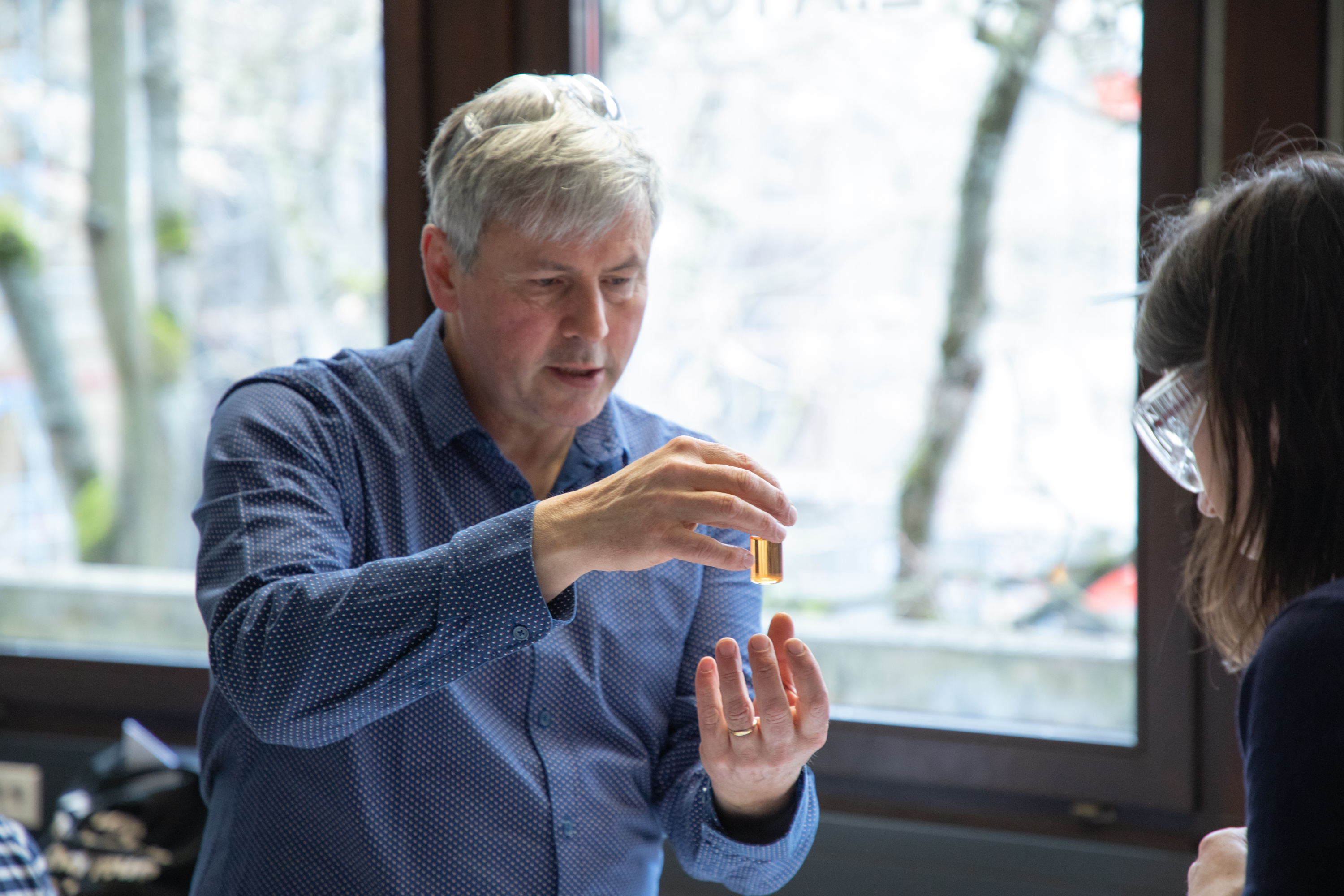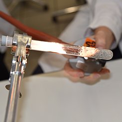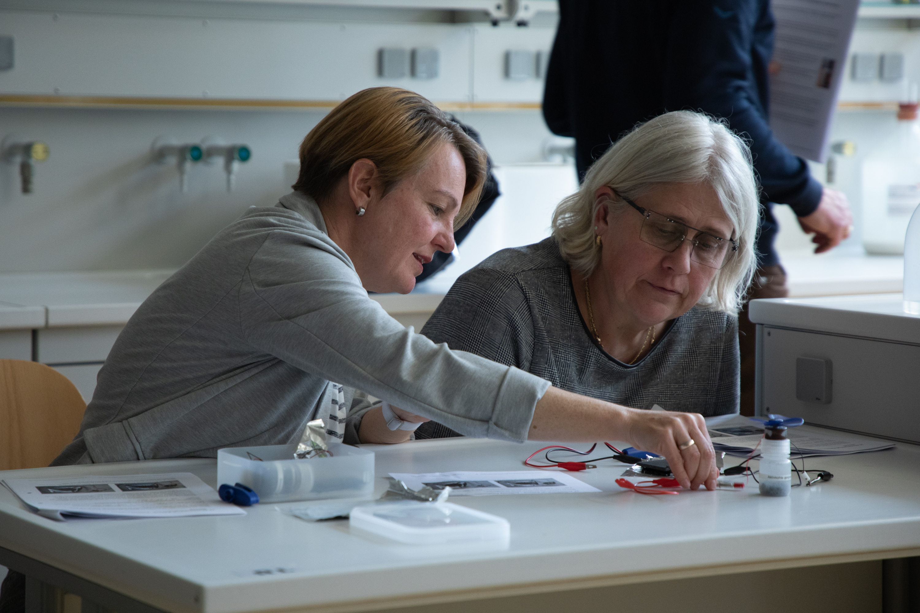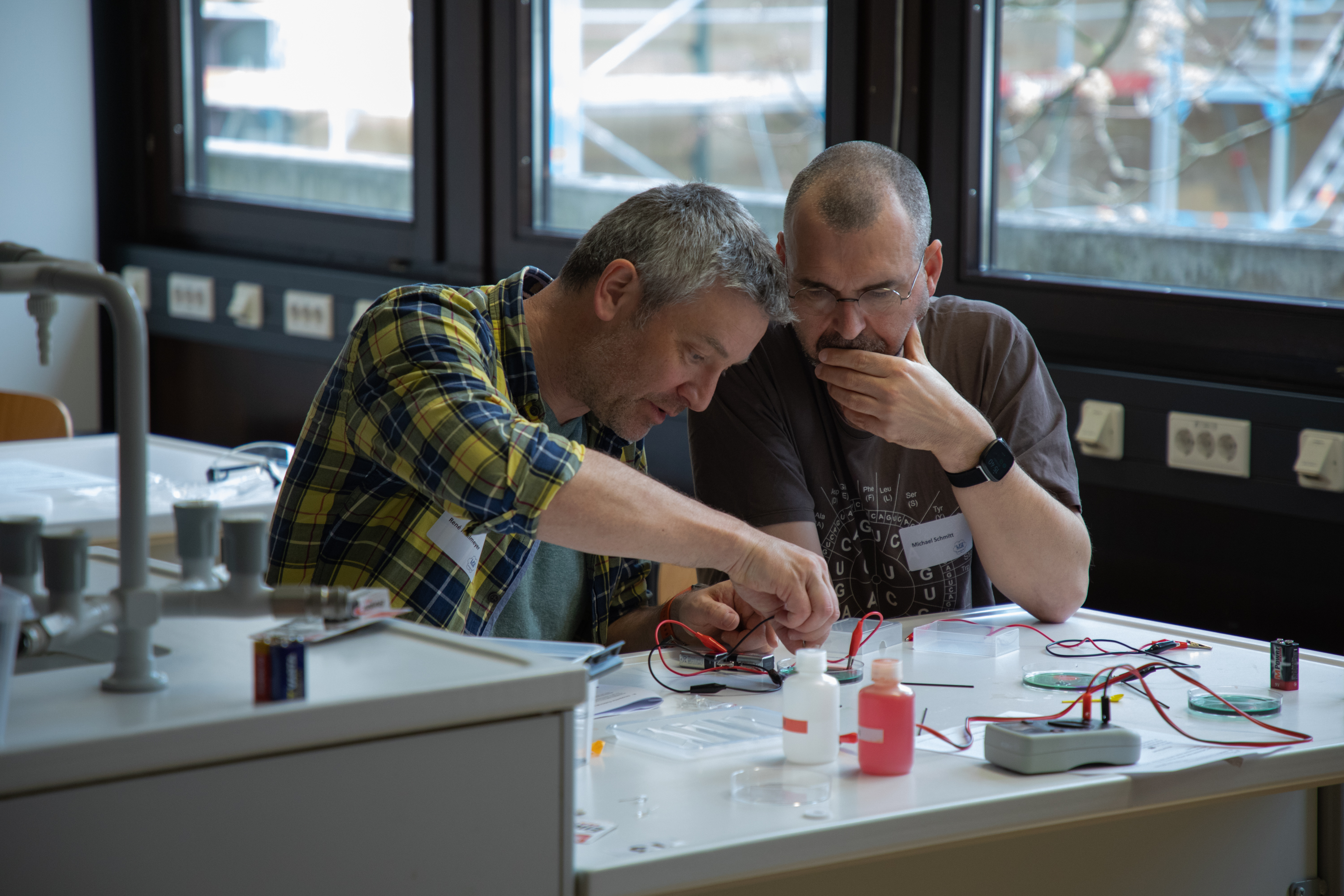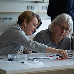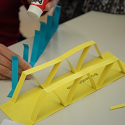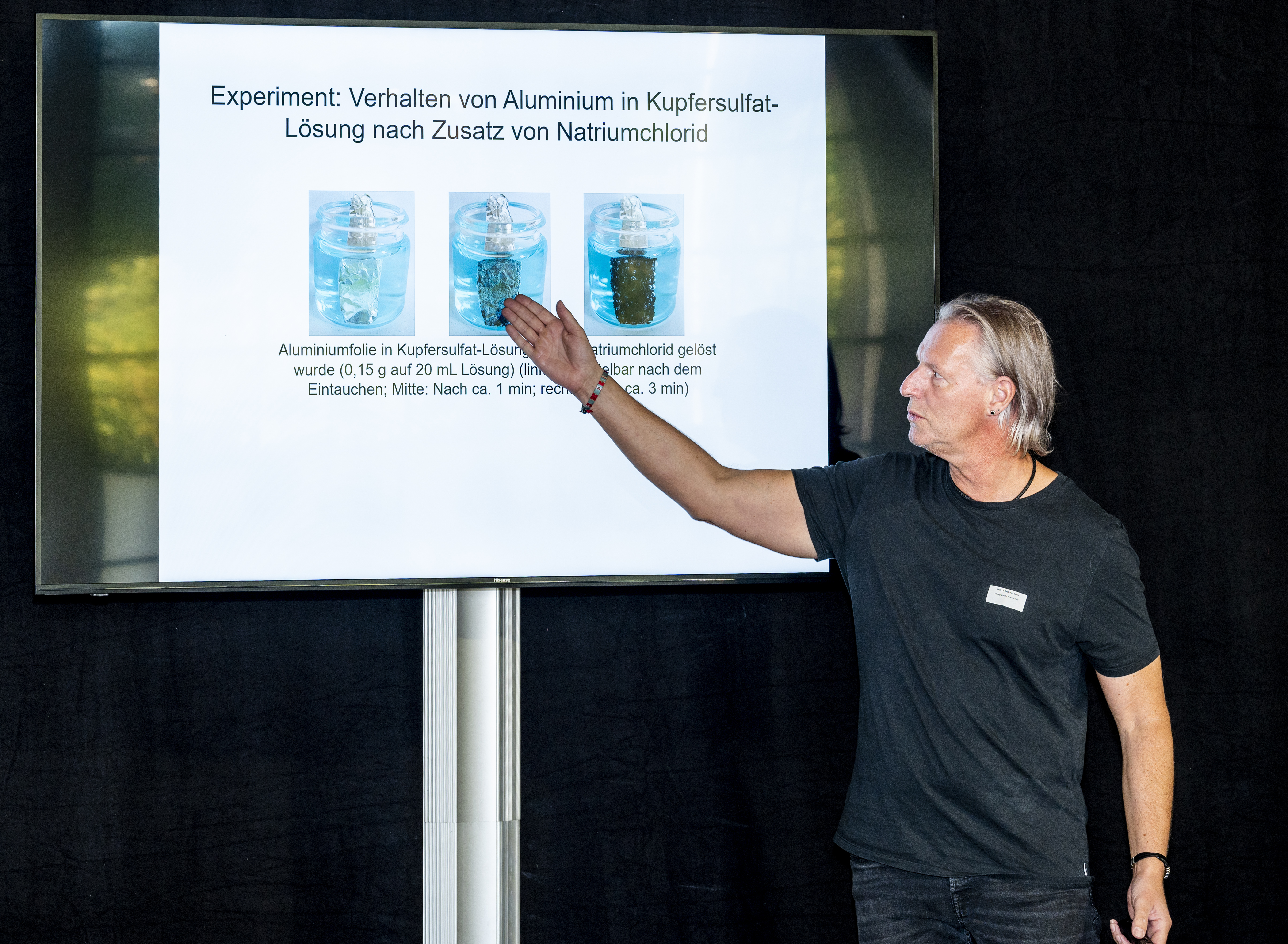 Am Nachmittag starteten für die eingeladenen Lehrkräfte die drei Workshops „Brücken – Erfinden und Konstruieren“ (Science & Technologie e.V.), „Chemie verstehen mit schönen und überraschenden Phänomenen“ (Prof. Klemens Koch, PH Bern) und „Experimente zu modernen Materialien und Nachhaltigkeit im Chemieunterricht“ (Prof. Dr. Stefan Schwarzer, Universität Tübingen) in den Räumen des Instituts für Chemie.
