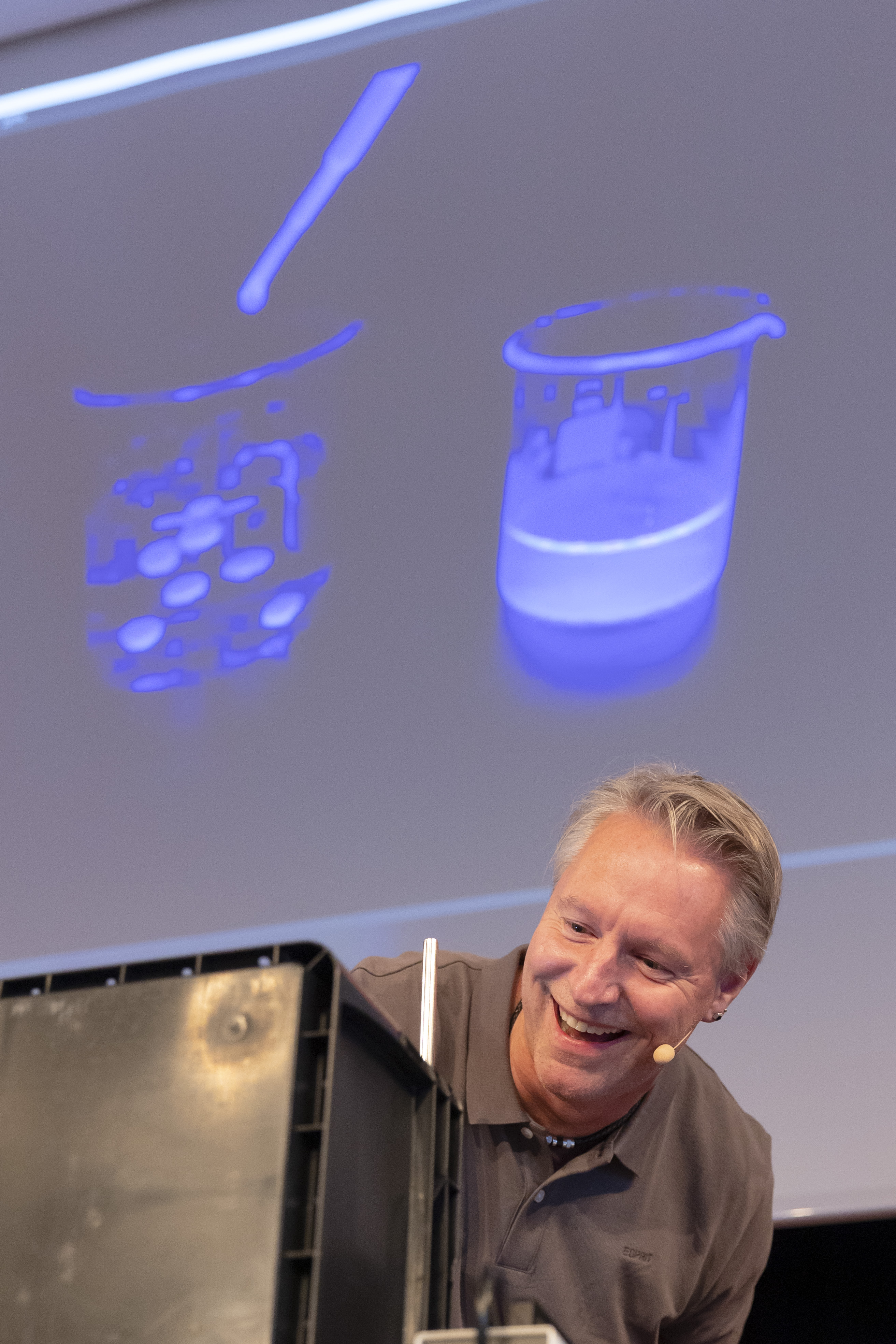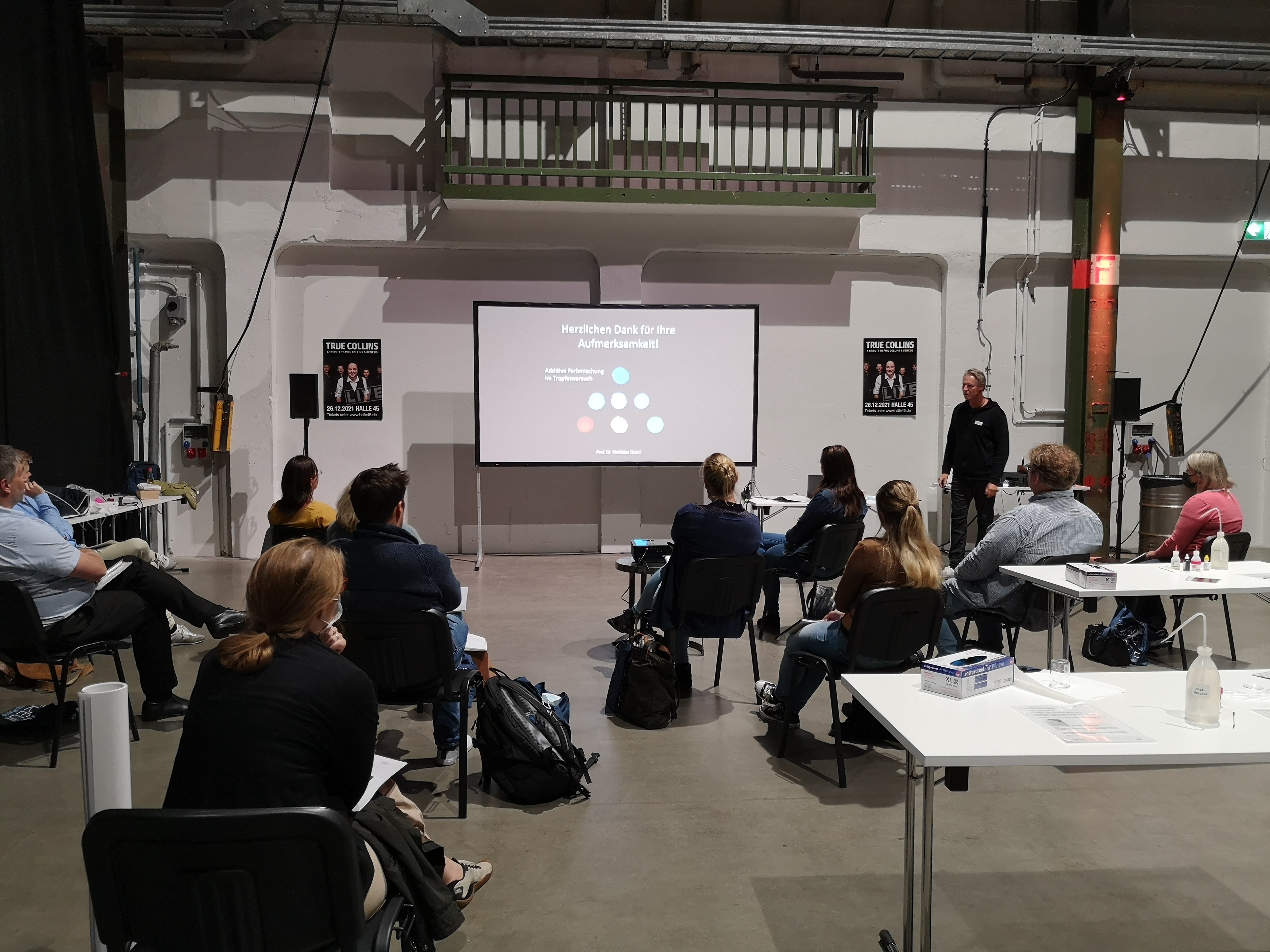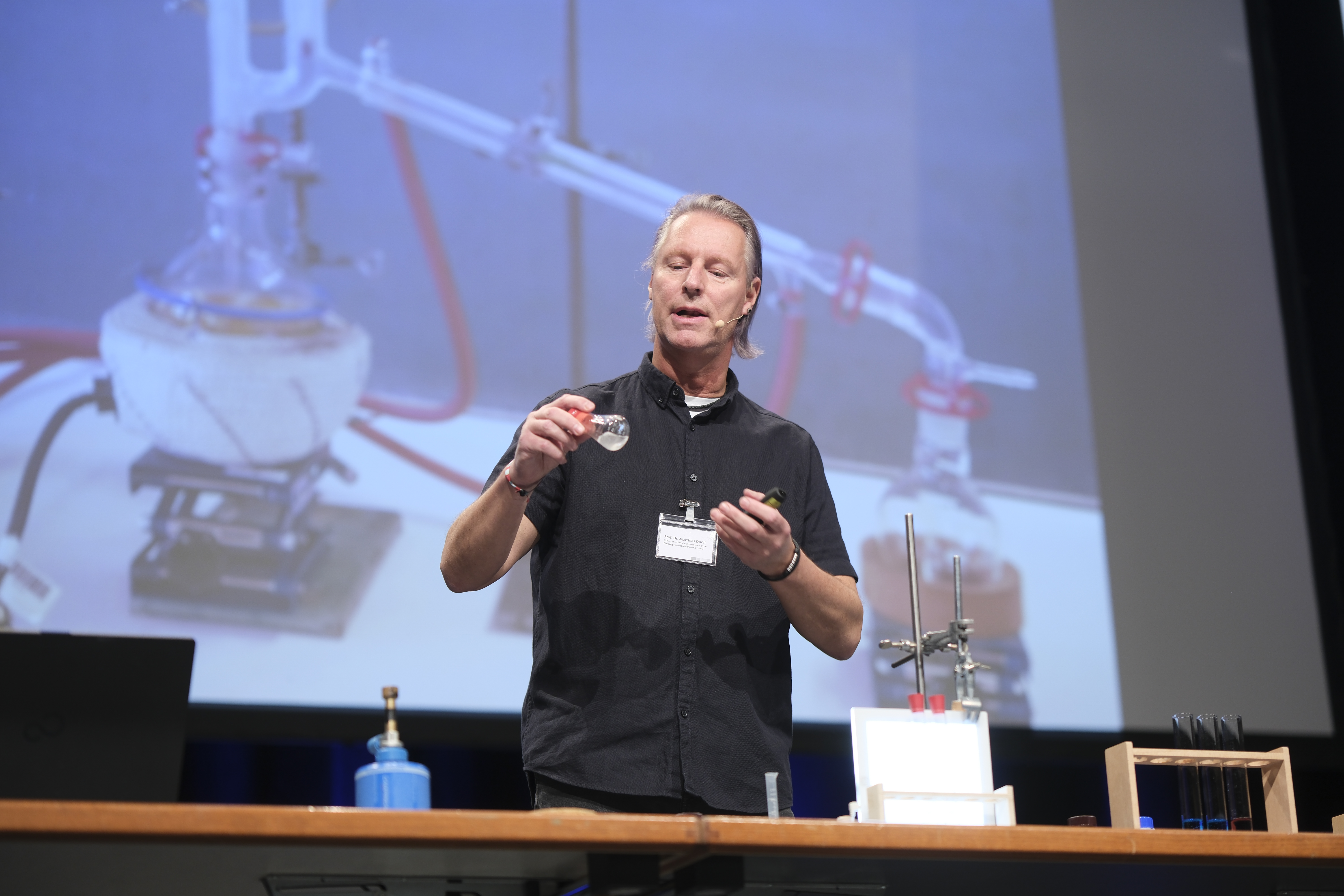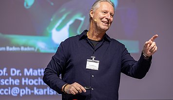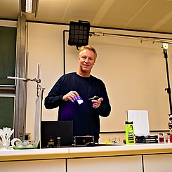 Der zweite Tag war für Lehrkräfte an weiterführenden Schulen reserviert. Prof. Ducci und Dr. Brezesinski (beide PHKA) führten ebenfalls am Vor- und Nachmittag jeweils einen Workshop durch. Den Plenarvortrag der Veranstaltung hielt Prof. Ducci. Darin präsentierte er (er)leuchtende Experimente für den naturwissenschaftlichen Unterricht.