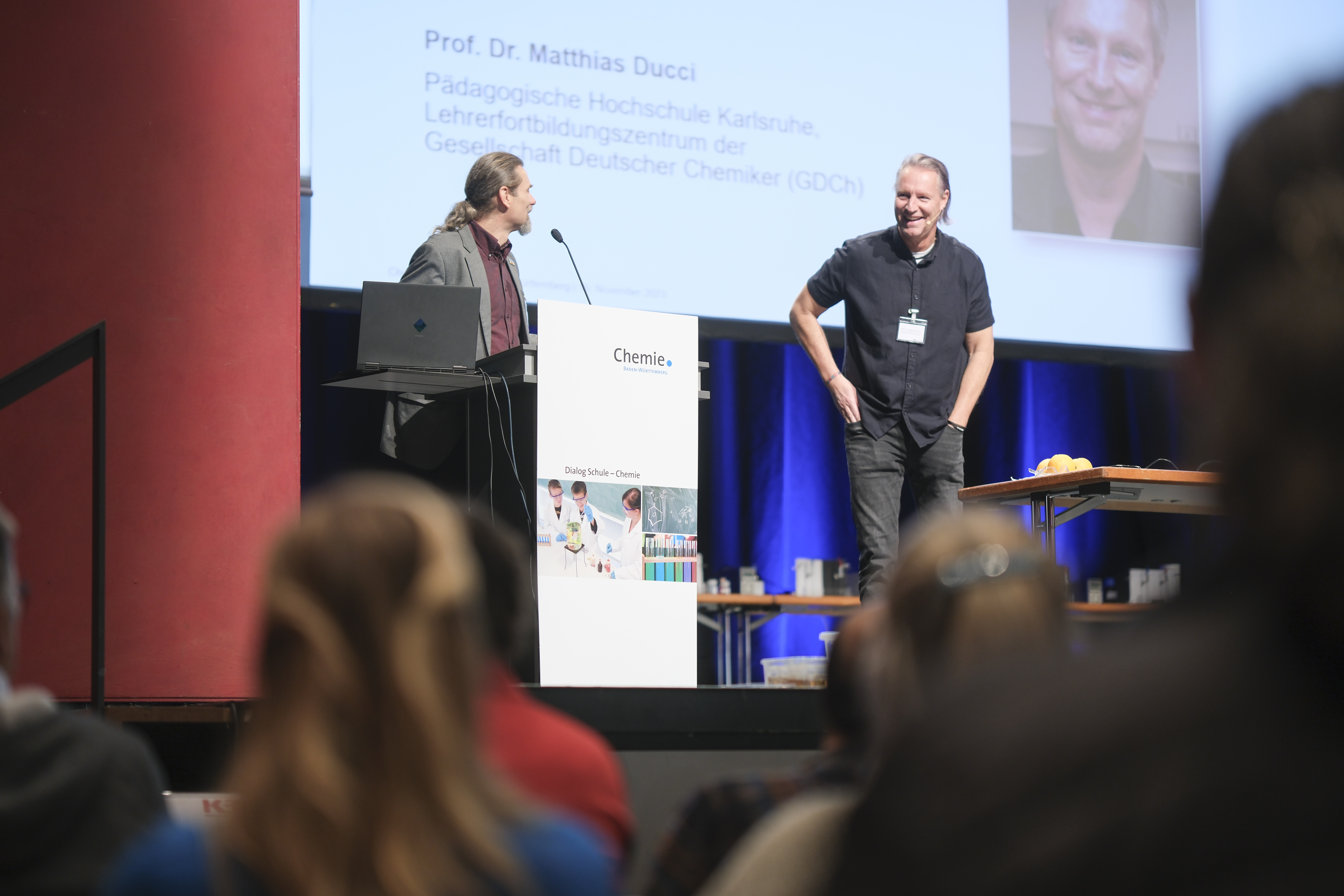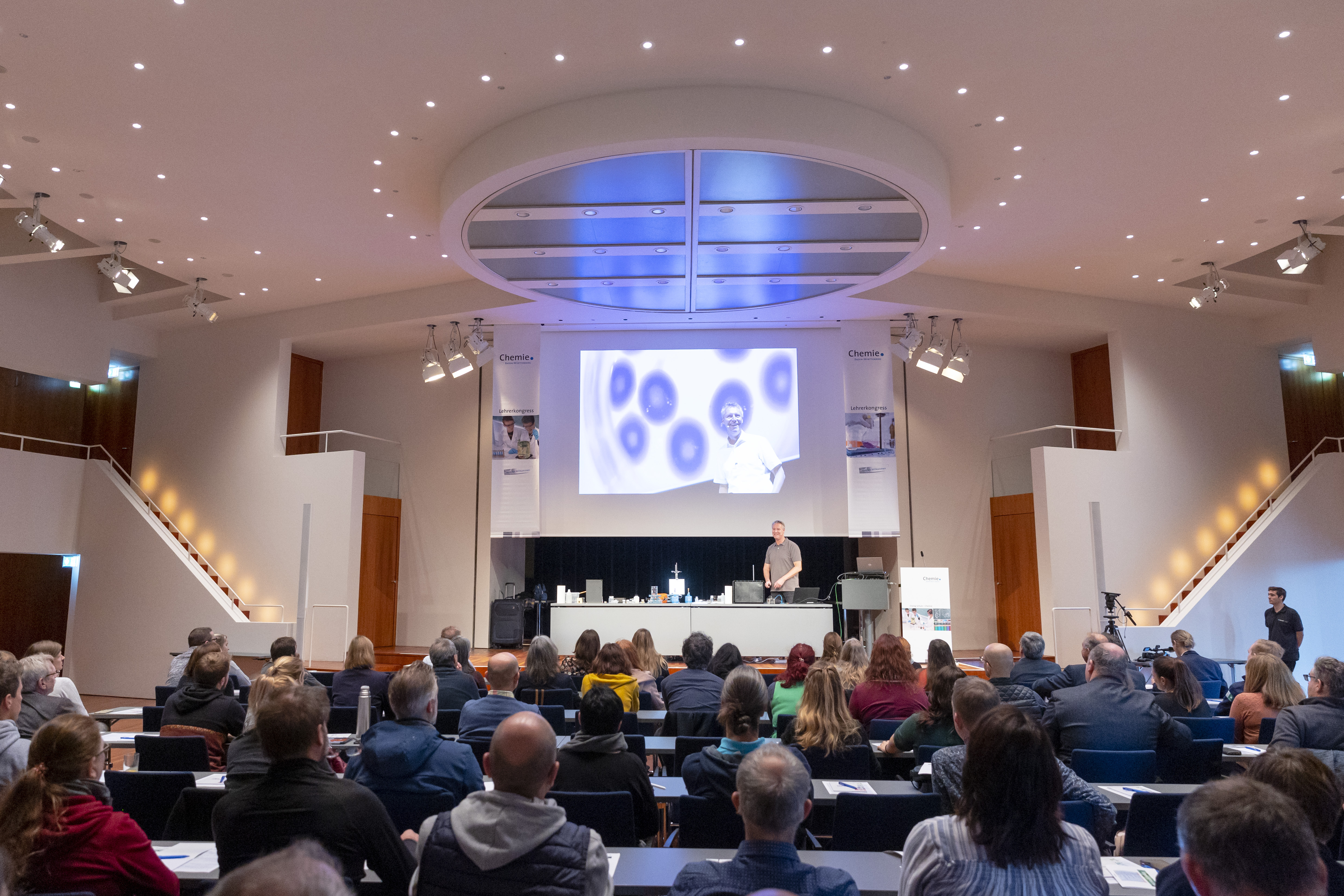 Am 17. November 2022 fand der diesjährige Lehrerkongress der Chemie-Verbände Baden-Württemberg im Konzerthaus in Freiburg statt. Nach Grußworten von Björn Sucher, dem Hauptgeschäftsführer des Arbeitgeberverbandes Chemie Baden-Württemberg sowie Ministerin Schopper (Grußbotschaft per Video) folgte ein Plenarvortrag von Prof. Ducci (Institut für Chemie/PHKA). Darin präsentierte Prof. Ducci seine neuesten Entwicklungen zum Themenfeld „Chemische Reaktionen in Alginatbällchen“ in Form von zahlreichen Live-Experimenten. Das GDCh-Fortbildungszentrum für Chemielehrkräfte der PHKA war zudem in der Ausstellung mit einem Informationsstand unter der Leitung von Frau Dr. Brezesinski vertreten. Die Veranstaltung verzeichnete etwa 100 Teilnehmende.