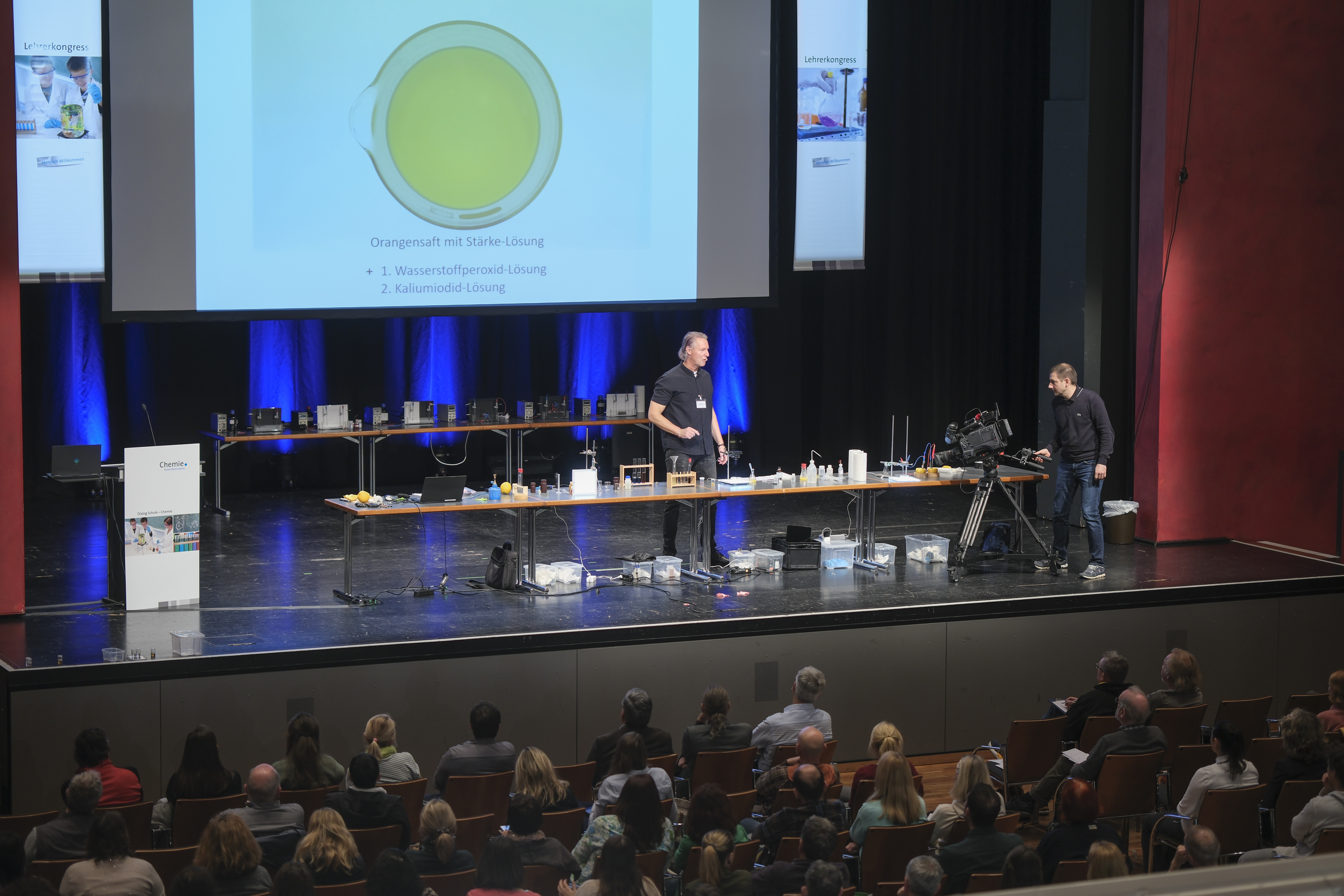 Rund 240 Pädagoginnen und Pädagogen haben sich am 15. November auf dem Lehrerkongress von Chemie.BW ausgetauscht. Prof. Ducci hielt den ereignisreichen Eröffnungsvortrag “Die Orange – ein fruchtiger Experimentierkasten!“. Neben einem weiteren Vortrag am Nachmittag standen insgesamt 11 verschiedene Infoforen und ein Markt der Möglichkeiten mit zahlreichen Ausstellern auf dem Programm. Das Institut für Chemie der Pädagogische Hochschule Karlsruhe war neben dem Experimentalvortrag auch mit einem Infostand zum GDCh-Lehrerfortbildungszentrum vertreten, an dem auch die Experimente aus dem Vortrag von den Lehrkräften ausprobiert werden konnten.